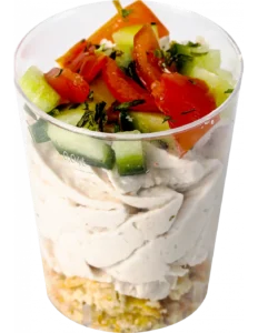 3. Dans des verrines, déposez une couche de préparation au thon, puis une couche de légumes coupés.
